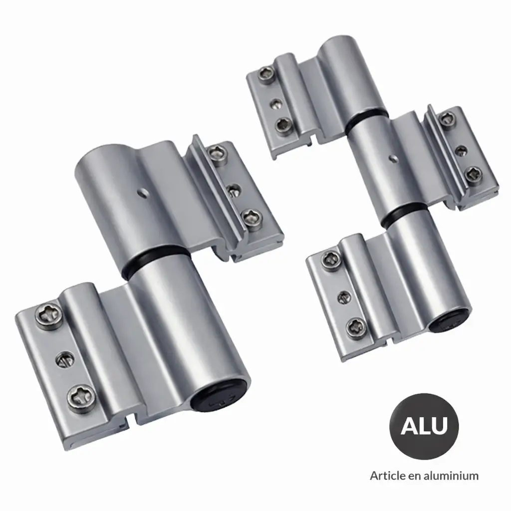 Paumelle pour porte en aluminium, douille de centrage supérieure en zamak, pré-monté sur un pivot en acier inox, douille de centrage inférieur en Delrin. Vis en acier inox, bouchons en nylon. Réglage horizontal (+/- 1mm) à porte fermée avec dispositif antieffraction intégré. Elle peut être appliquée directement sur la gorge sans usinage.