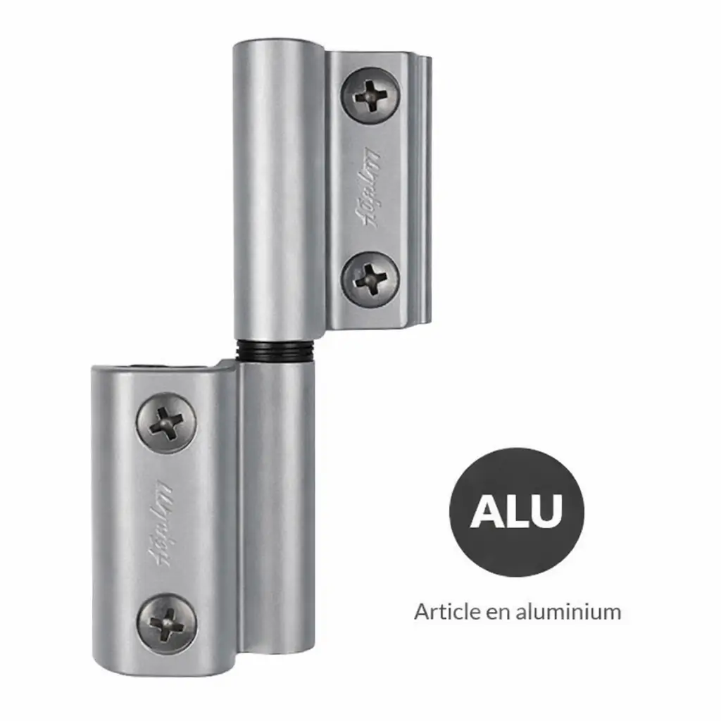 Paumelle pour fenêtre en aluminium. Axe de rotation en acier inox Ø 7mm. Douille de rotation en nylon auto lubrifié. Vis et plaques de fixation en acier inox, pré-montées. Disposition pour l’emploi des douilles excentriques pour le réglage horizontal ou le réglage par pression du joint de la distance entre le dormant et l’ouvrant (+/- 0,6mm).